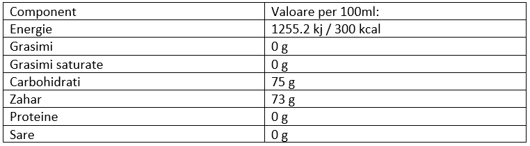 Ingrediente: Piure și suc de căpșuni din concentrat (55%): apă, piure concentrat de căpșuni, suc concentrat de căpșuni, Zahăr, Acidifiant: acid citric, Agent de îngroșare: pectină, Colorant alimentar: suc de legume, Arome naturale, Conservant: sorbat de potasiu.