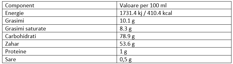 Ingrediente: zahăr din trestie, amidon de porumb, grăsime de cocos nehidrogenată, unt de cacao, sare, arome, sirop de glucoză deshidratată, proteine din lapte, agent de creștere: E341(III), stabilizator: E451(I), coloranți naturali: annatto.