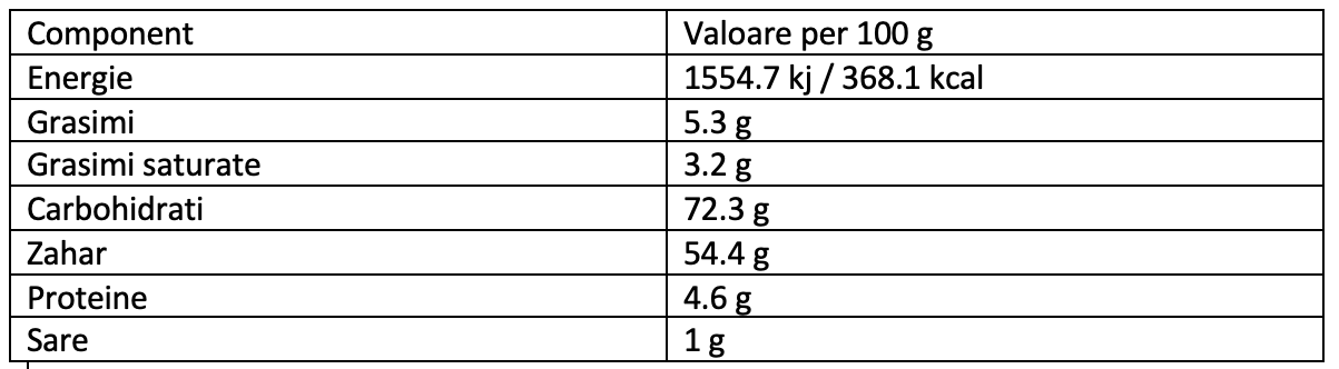Ingrediente: zahar din trestie, pudra de cacao 22/24, amidon de porumb, arome, sare, antiaglomerant: E341.