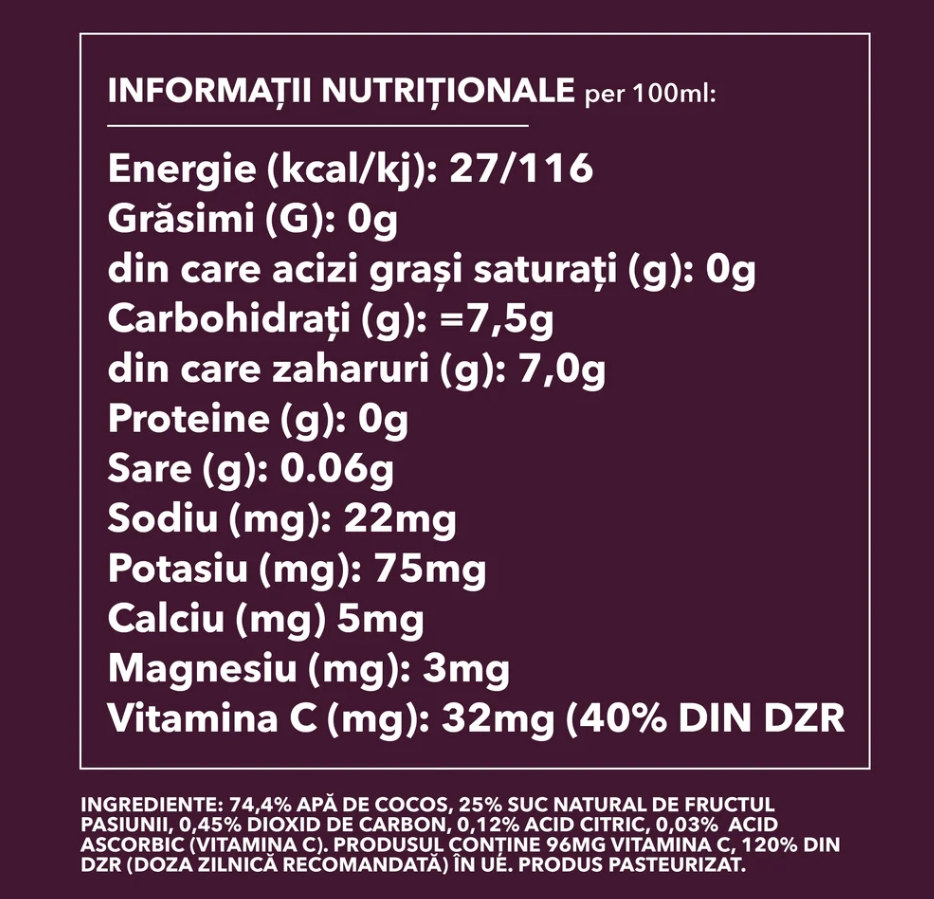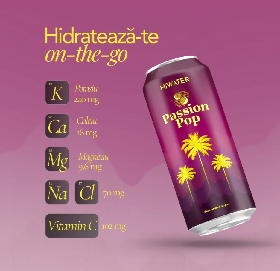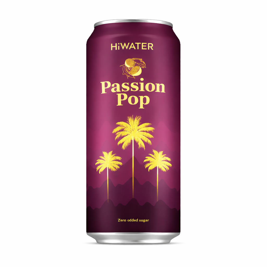 Un better-for-you soda dar cu HIWATER SPARKLING în ADN. Passion Pop vine cu apă de cocos sparkling combinată cu suc natural de fructul pasiunii.