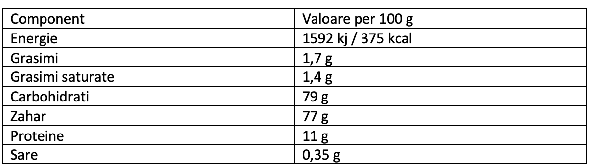 Ingrediente: zahar, maltodextrina, lapte praf degresat, proteine din lapte, arome, zahar caramelizat, scortisoara, agent de ingrosare: E415, emulgator: E471, smantana(unt de cacao, sirop de glucoza, proteine din lapte, stabilizator E451i, antiaglomerant: E551), sare.