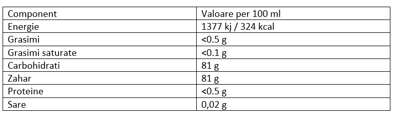 Ingrediente: zahăr de trestie 100%, apă pură din Alpii francezi, arome, colorant: allura Red AC, stabilizator: E445.