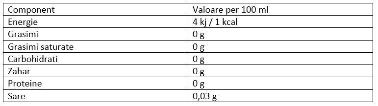 Ingrediente: Apă pură din Alpii francezi, dextrină, aromă artificială, acesulfam de potasiu, sucraloză, gumă de celuloză, gumă de xantan, colorant: caramel, sorbat de potasiu, benzoat de sodiu.