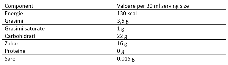 Ingrediente: sirop de glucoza, apa, zahar, ciocolata cu lapte 10% (zahar, unt de cacao, pasta de cacao, lapte praf, emulifiant: lecitina de soia, aroma naturaala de vanilie), pasta de alune 8%, stabilizator :glicerina naturala, lapte praf degresat, pudra de cacao cu continut scazut de grasime, amidon, emulsifiant: lecitina de soia, acidifiant: acid tartaric, sare, conservant: sorbat de potasium, arome artificiale.