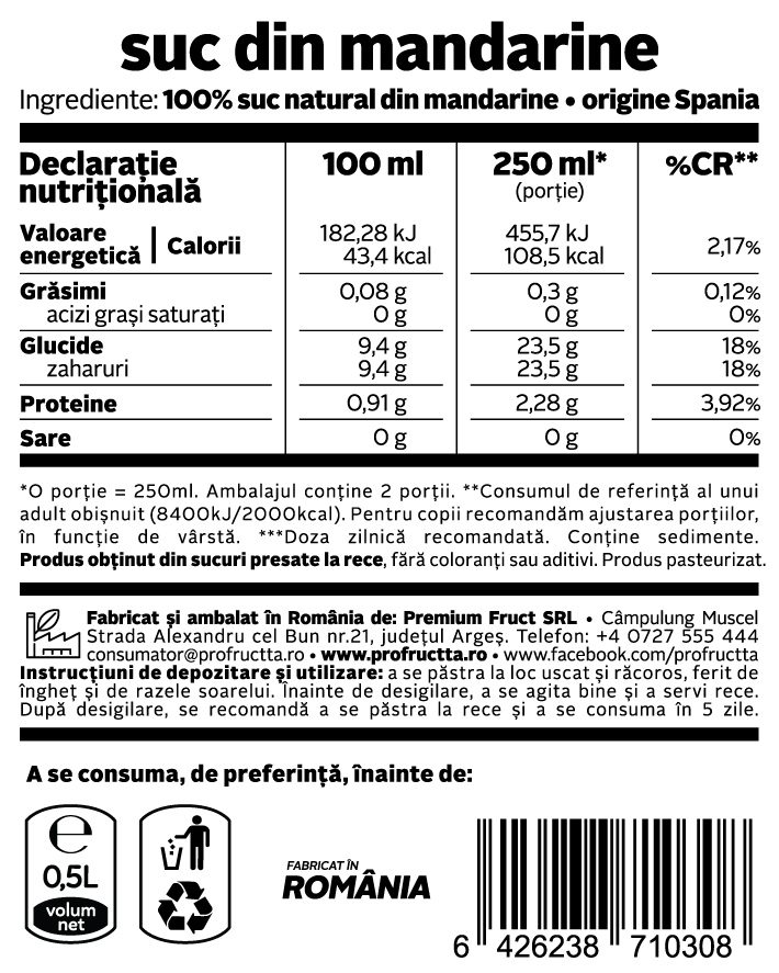 Ingrediente: 100% suc natural din mandarine (origine Spania).